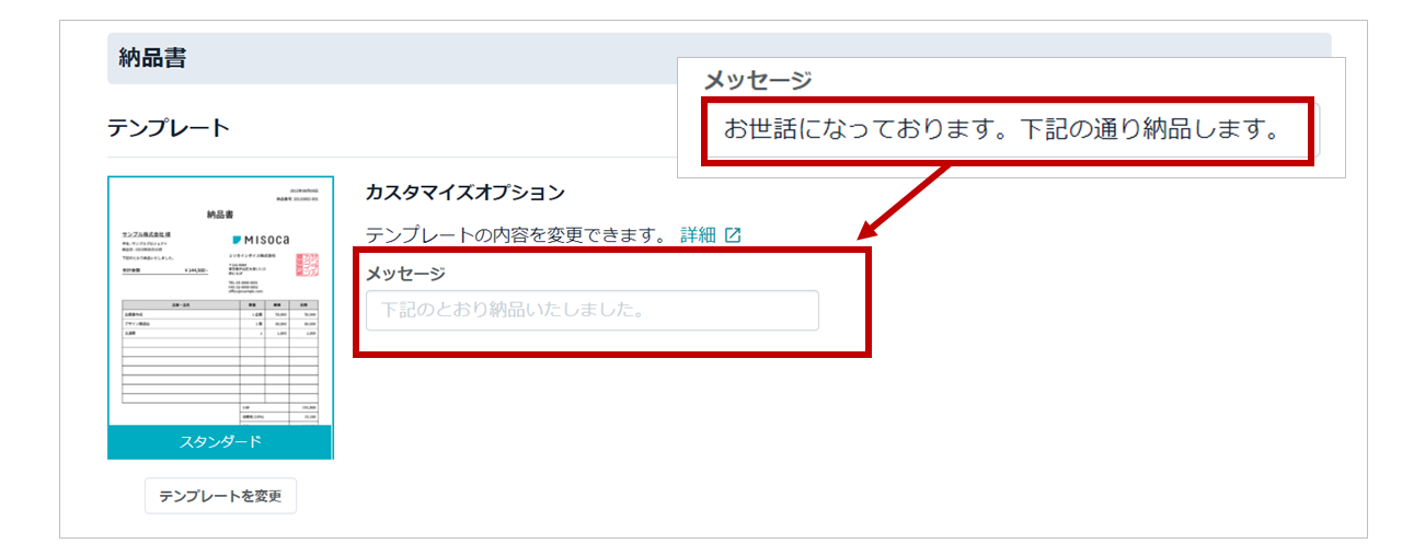 すでに請求書の表題やメッセージ設定に対応していたテンプレートに加え、下記のテンプレートでも設定できるようになりました。